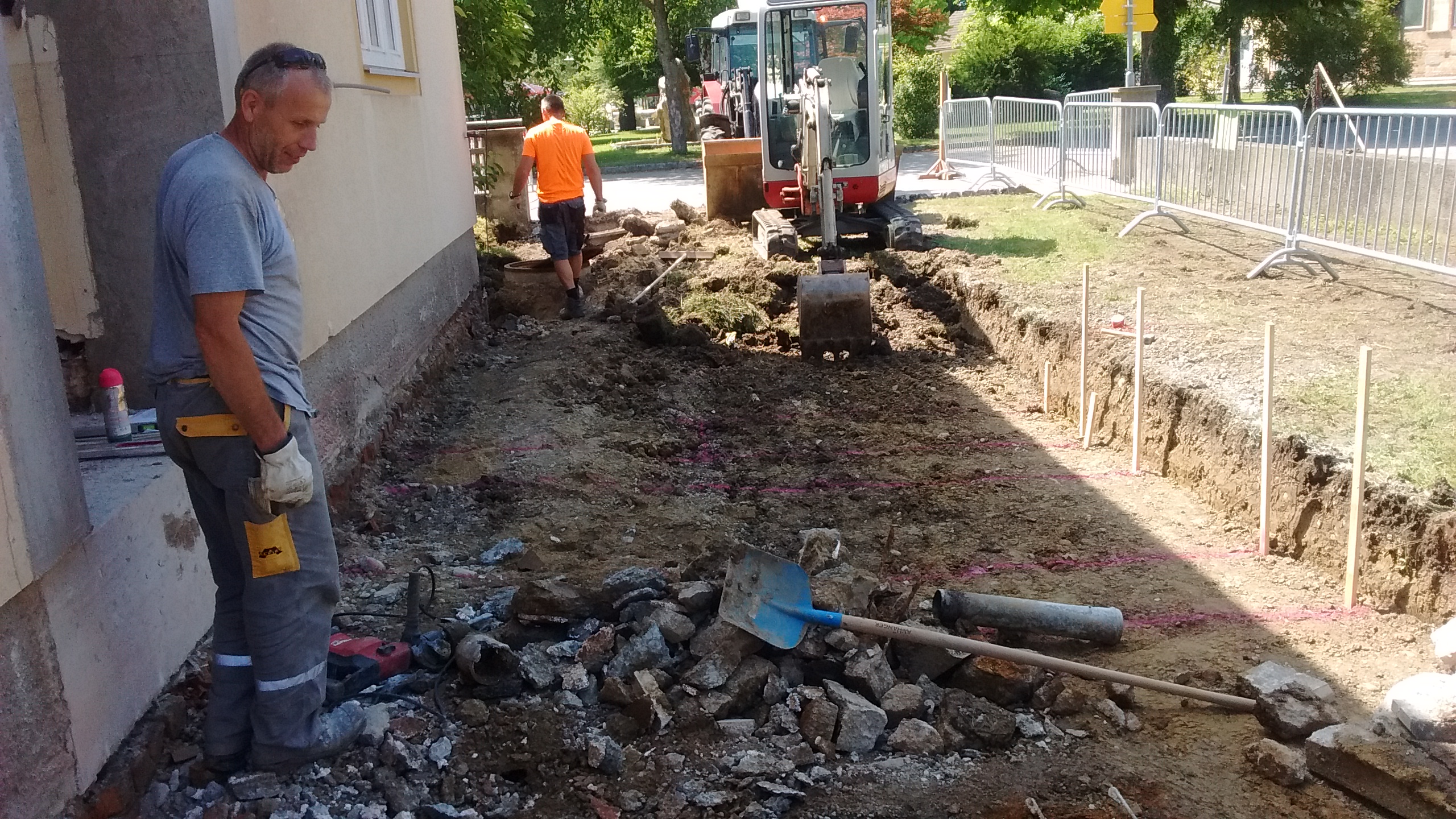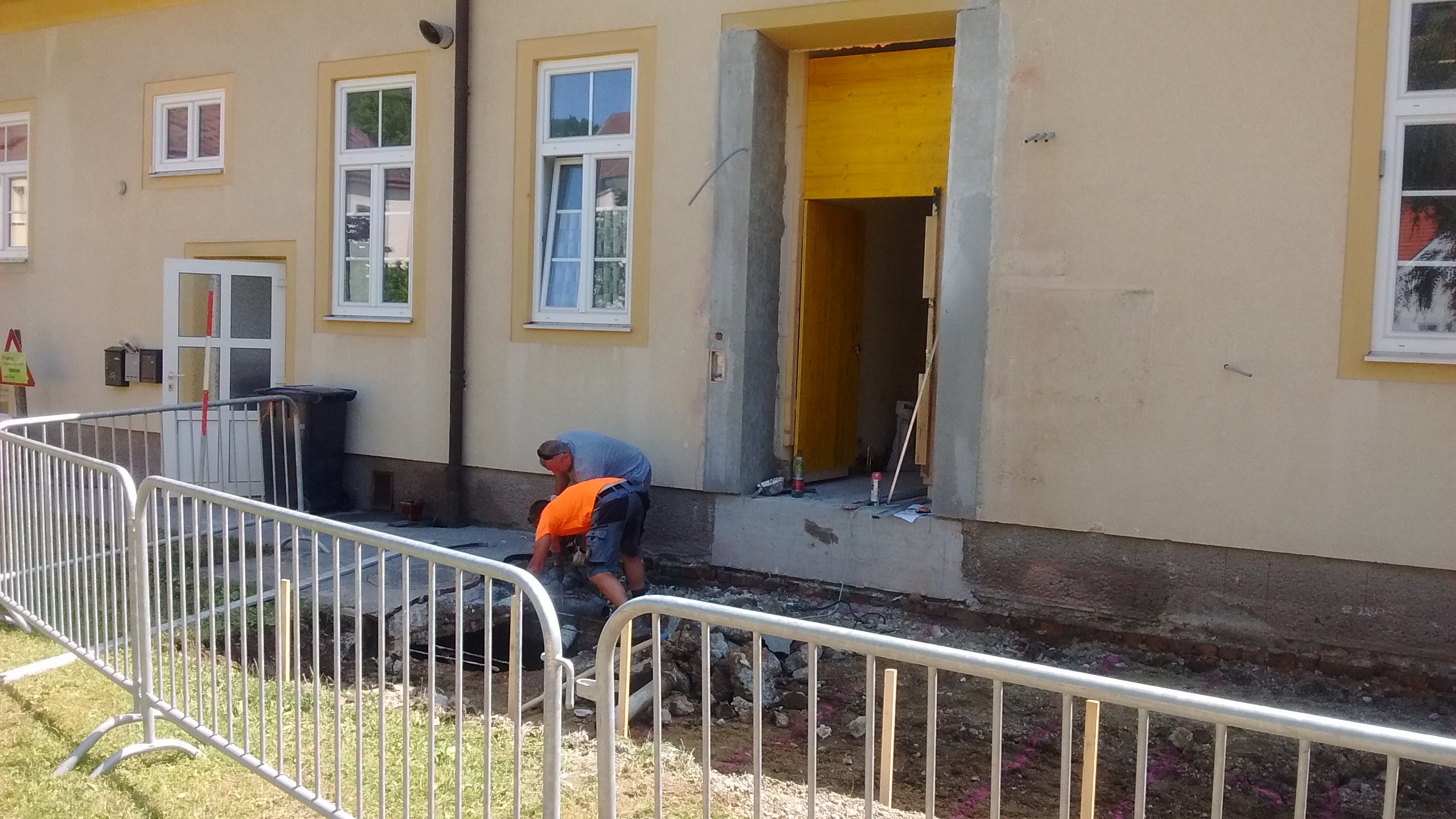 Für den barrierefreien Zugang zum Gemeindeamt (Rampe) wird das Fundament vorbereitet. Auch hier zeigt sich, wie schon bei den Arbeiten in den Innenräumen: immer wieder gibt es „Überraschungen“, mit denen die Arbeiter zurecht kommen müssen!