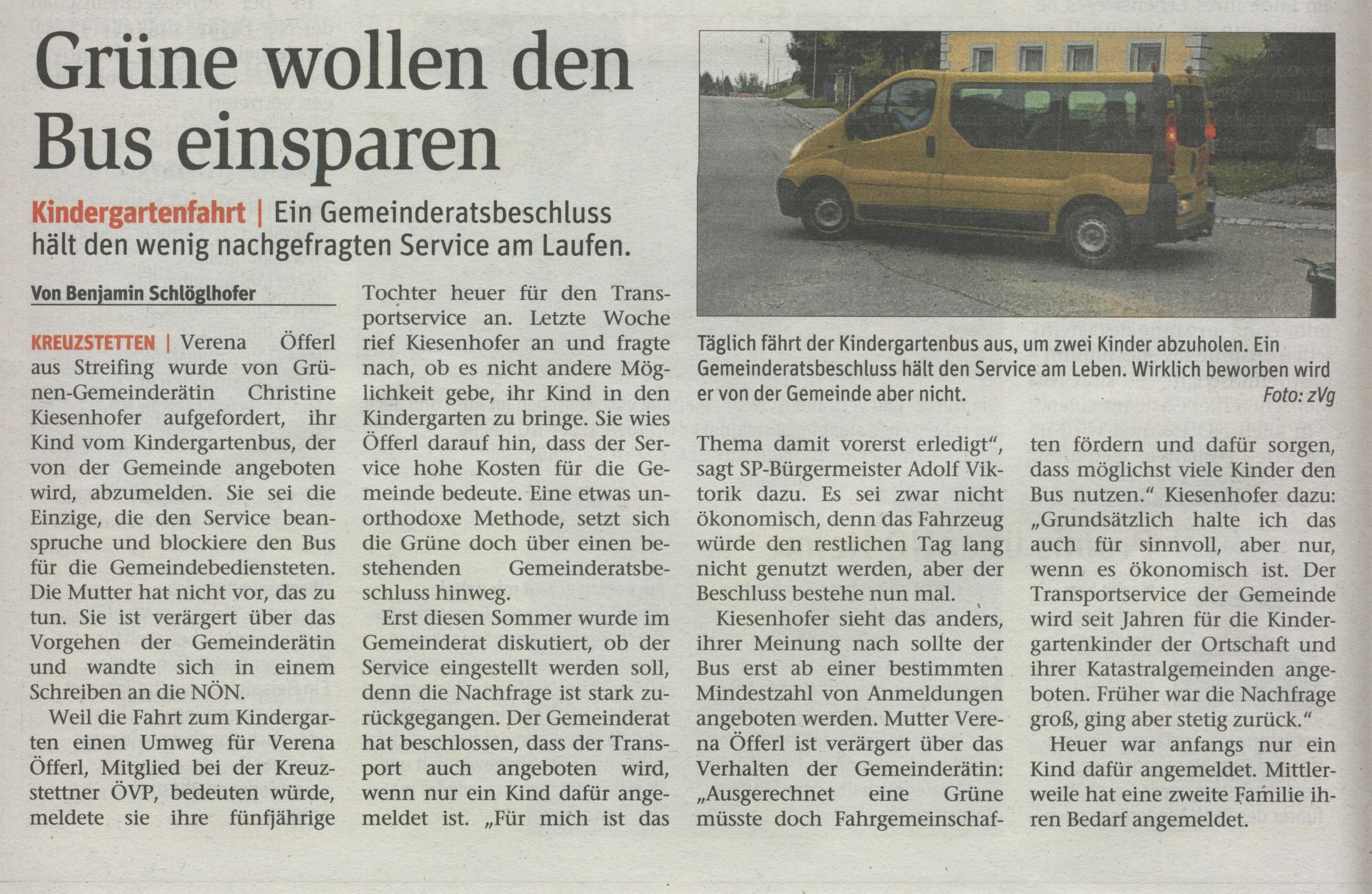 In der Gemeinderatssitzung vom 2. August war der Kindergartenbus ein Tagesordnungspunkt; von Bgm. Viktorik war angedacht, eine Mindestanzahl an Anmeldungen für die Fortführung des Busses zu beschließen, nachdem die Nutzung seit Jahren rückläufig ist. Dies wurde vehement von vielen Gemeinderäten kritisiert, es wurde schließlich beschlossen, „dass der Kindergartenbus bei Bedarf – schon ab einem Kind – wieder weitergeführt wird“. Abstimmungsergebnis: einstimmig