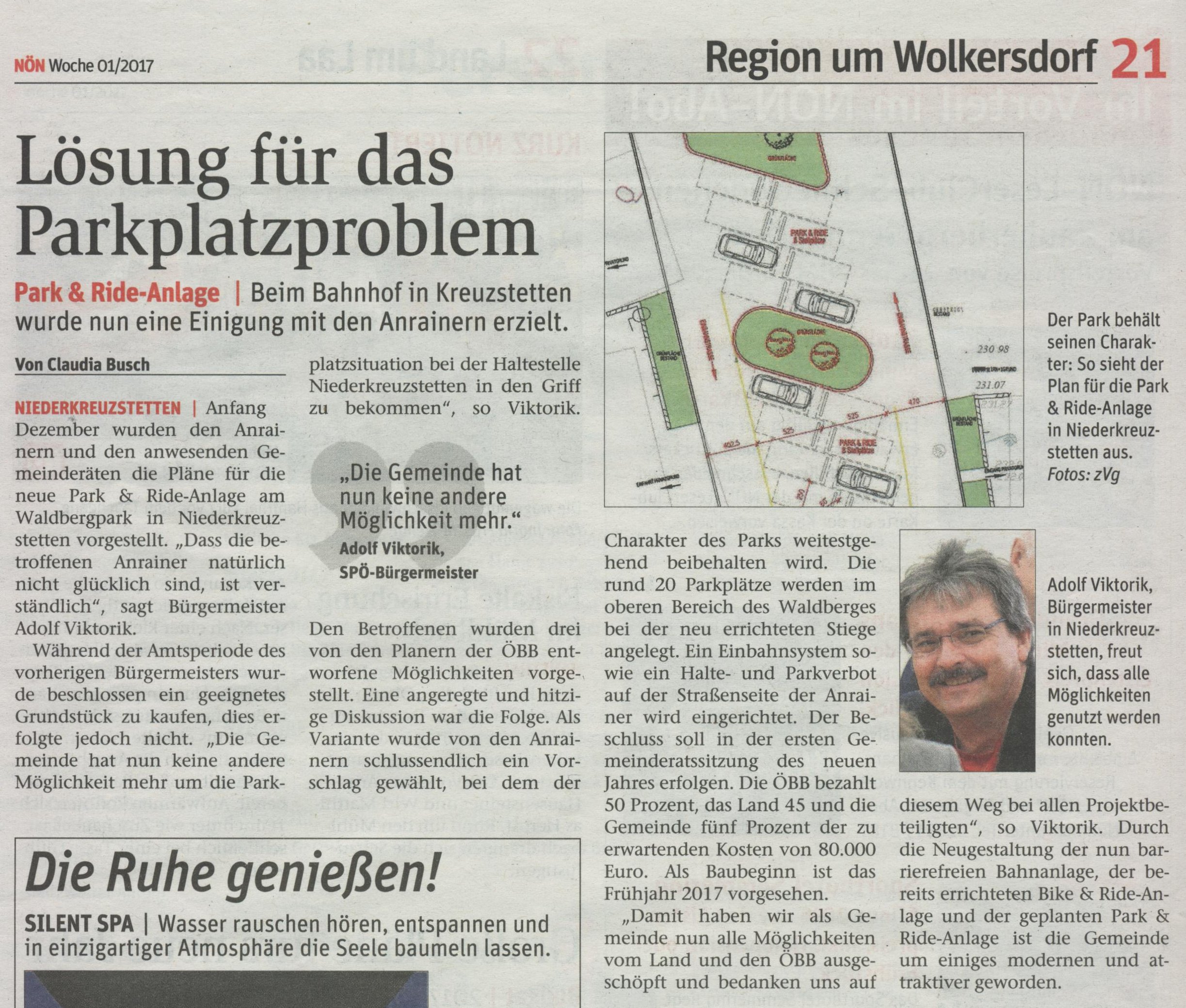 Im Jänner 2016 hat die ÖBB mit dem Gemeindevorstand Gespräche über die Umgestaltung der Haltestelle Niederkreuzstetten geführt. Schon damals wurde auch die Frage einer Park& Ride-Erweiterung angesprochen, da der bestehende Parkplatz schon lange Zeit viel zu klein ist.