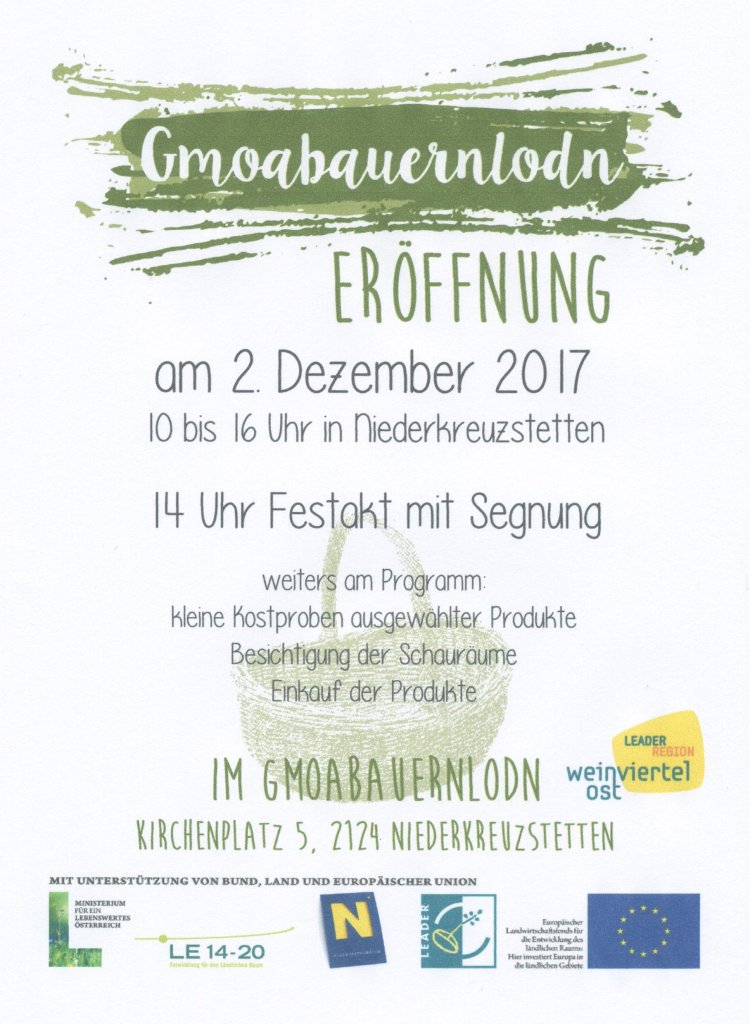 Einladung zur Gmoabauernlodn-Eröffnung Teilen mit: Klicke, um auf X zu teilen (Wird in neuem Fenster geöffnet) X Klick, um auf Facebook zu teilen (Wird in neuem Fenster geöffnet) Facebook Gefällt mir Wird geladen …