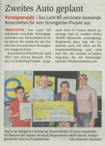 Beim e-Mobilitätstag am 26. Mai 2018 wurde das E-Carsharing-Projekt „Kreuzstetter Stromgleiter“ von LH-Stv. Stephan Pernkopf ausgezeichnet.