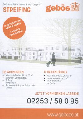 Am 25. Jänner 2019 findet um 18 Uhr im FF-Haus Streifing eine Info-Veranstaltung zum Bauvorhaben der Wohnbaugenossenschaft Gebös statt. Eine Vormerkung für die Wohnungen/Reihenhäuser kann bereits erfolgen https://www.geboes.at/Wohnungen/Häuser Streifing