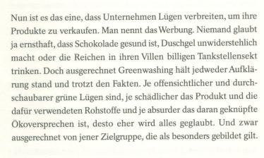 Zur Gemeindezeitung wird mir vorgeworfen, mit der Behauptung von Lügen den Ruf der Firma zu schädigen (die ich mit keinem Wort erwähne) Dazu den Auszug aus dem Buch „Die grüne Lüge“ von Kathrin Hartmann, Seite 18 Kathrin Hartmann: Die grüne Lüge. Ich habe das Wort Lügen in der Gemeindezeitung bewusst unter Anführungszeichen gesetzt, ich hätte mich niemals so zu formulieren getraut. Anders als viele der genannten Firmen und Produkte in ihrem Buch sind PV-Anlagen gut für die Umwelt und kein Greenwashing. Ich bin aber Gemeinderätin und Bürgerin der Gemeinde Kreuzstetten: darum hätte ich gerne, dass meine Gemeinde von PV-Anlagen profitiert (finanziell, nicht nur durch ein gutes Image als nachhaltige Gemeinde)