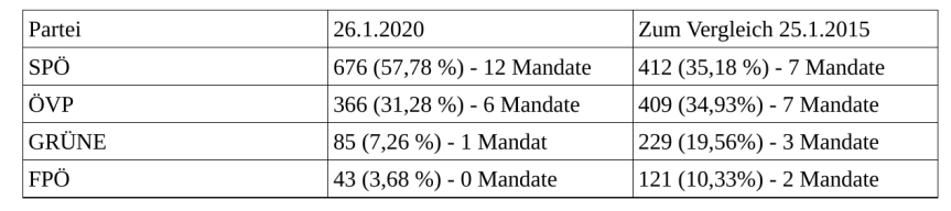 Aktualisierung 27.1. die Kundmachung des Gemeindeamtes zum Wahlergebnis. Kundmachung des Ergebnisses der Gemeinderatswahl. Zwei Wochen ist Gelegenheit für Einsprüche, der früheste Termin für die konstituierende Gemeinderatssitzung ist daher der 11.2., der späteste Termin der 10.3. (Wahlkalender_GRW_2020). Die angegebenen Gemeinderäte sind nur eine Auflistung nach der Kandidatur auf der Wählerliste, Veränderungen sind möglich, wenn ein Wahlwerber auf sein Mandat verzichtet.