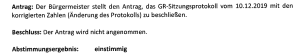 Laut Protokoll der Sitzung vom 4.8.2020 wurde das Protokoll der GR-Sitzung vom 10.12.2019 NICHT BESCHLOSSEN – siehe Umlaufbeschluss November 2020. Dazu habe ich am 9.12. den Bürgermeister, die Gemeinderäte und die Schriftführerin per Mail informiert – keine Reaktion, kein TO-Punkt zur (neuerlichen) Beschlussfassung des Protokolls bei der Sitzung am 21.12.