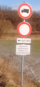 Überflüssig erscheint mir das Verkehrszeichen nach dem WAV-Bauplatz lt. Verordnung der BH vom August 2019: Es gilt ohnedies „Einfahrt verboten“ ausgenommen Anrainerverkehr, strenggenommen dürften auch keine LKWs bei Bauarbeiten zu den hinteren Häusern zufahren.