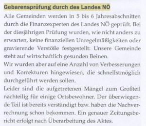 In der Gemeindezeitung schreibt der Bürgermeister zur Gebarensprüfung: „… wie nicht anders zu erwarten, keine finanziellen Unregelmäßigkeiten…“ Die Liste der belegbaren Falschinformationen in GR-Protokollen, Zeitungen… ist lang – ich glaube dem Bürgermeister schon lange nichts mehr!