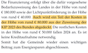 Auch für 2023 hat der Bund ein Kommunales Investitionsprogramm (KIP bzw. KIG – Kommunales Investitionsgesetz) von 1 Mrd. Euro beschlossen, das kommunale Investitionsprogramm 2023 ist eine erweiterte Version des Programms aus dem Jahr 2020. Ich habe die Durchführungsbestimmungen aufmerksam gelesen und werde die Anträge unserer Gemeinde genau beobachten (sie sind online einsehbar).