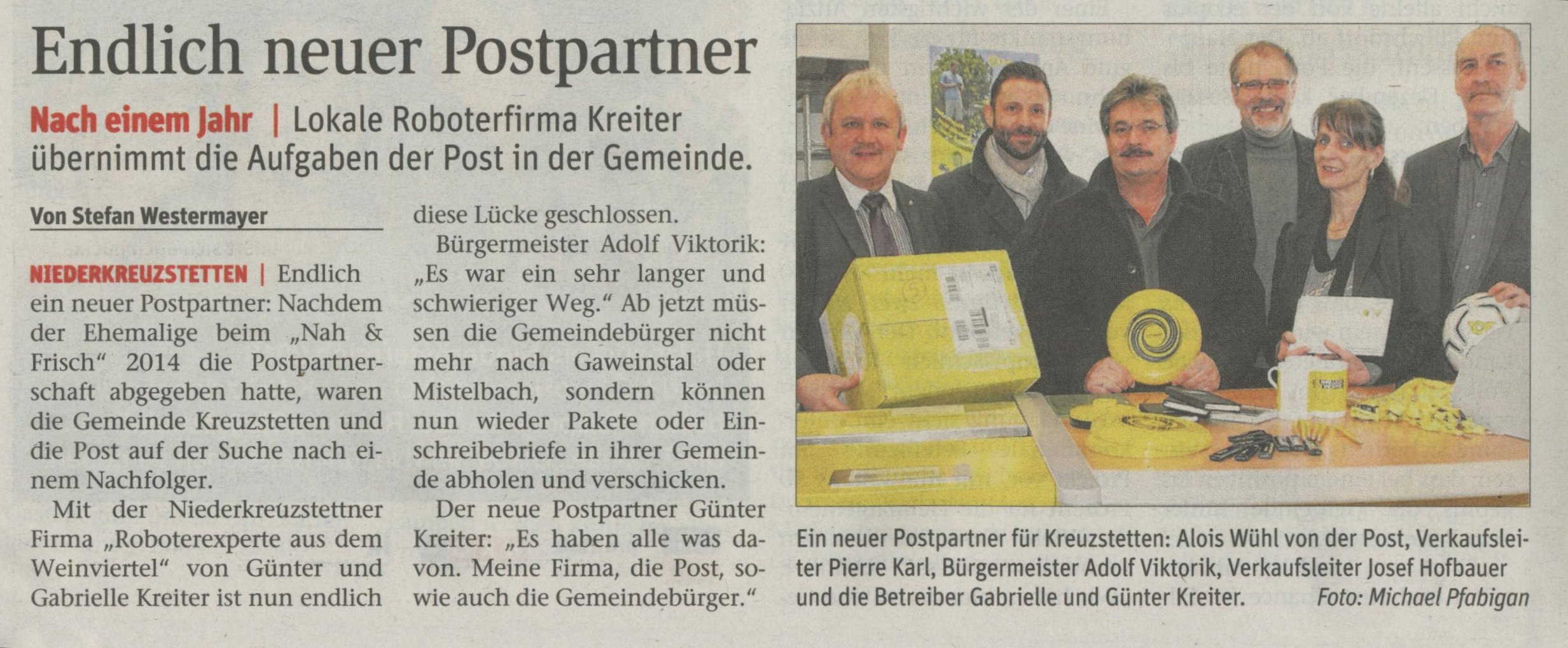 Zwischenzeitlich wird die Hinterlegestelle vom Postamt Gaweinstal nach Wolkersdorf verlegt ( für Kreuzstetter günstiger gelegen und auch mit öffentlichen Verkehrsmitteln zu erreichen). Dies ist leider mit einigen Pannen und Problemen verbunden, welche laufende Telefonate und Mails mit dem Zuständigen der Post erforderlich machen.